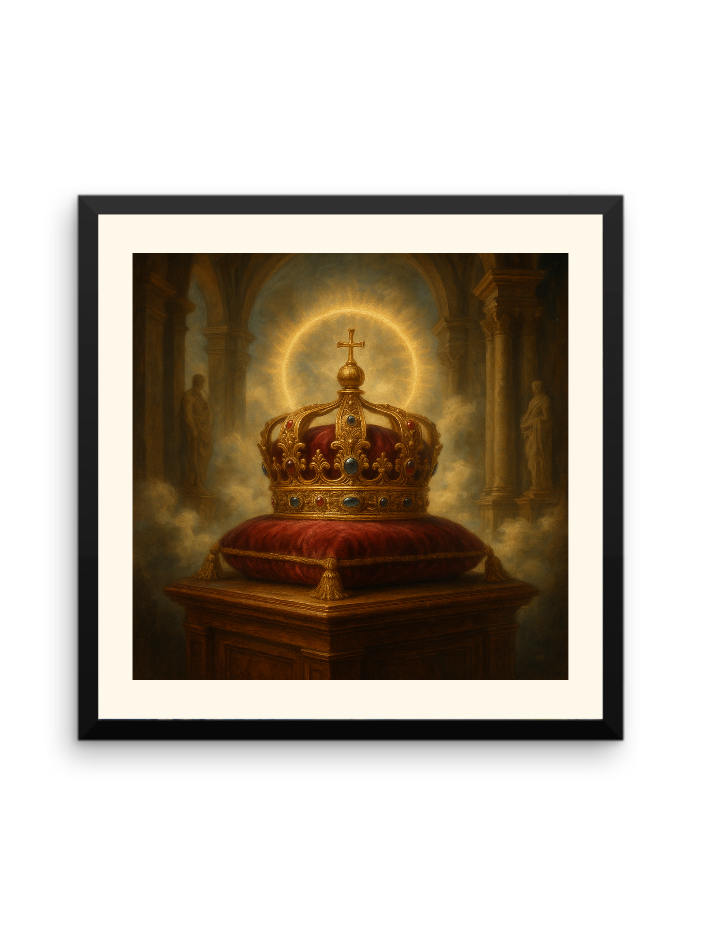A symbol of divine authority, Thy Kingdom Come is a masterwork of regal symbolism. The cross, encircled by an ethereal halo as the crown rests upon the velvet, speaks a singular truth: in this home, God’s Kingdom comes first.